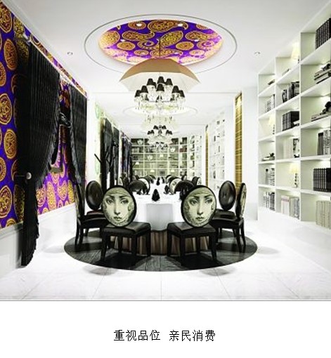 創(chuàng)意川湘菜餐廳呈現(xiàn)時尚、新潮的設計風格,店內(nèi)家具均以白色皮革箱造型為主,透露出溫馨的歸屬感和留洋小資品位;整體色彩純凈,弧形墻體、剔透的鳥籠及觸手可及迎面撲來雅致的書櫥使空間富于流動和變化;天棚掛懸的小胖白天使裝飾物進一步豐富了視覺空間,卡座以及四周炫目的世界一線奢侈品牌的彩繪圖案,使得店內(nèi)空間充滿了活力的跳躍感,彌漫著時尚青年向往的留洋生活氣息。