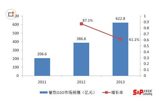 中國餐飲行業(yè)的線下市場規(guī)模非常龐大,這為餐飲O2O行業(yè)發(fā)展提供了廣闊的空間。有關(guān)數(shù)據(jù)顯示,2011年中國餐飲O2O市場規(guī)模為206.6億元;2012年中國餐飲O2O市場規(guī)模為386.6億元,同比增長87.1%;2013年市場規(guī)模達到622.8億元,同比增長61.1%。