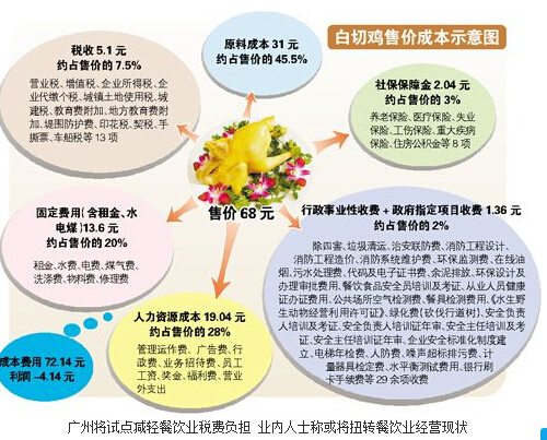 “點(diǎn)只白切雞,一條腿交稅!”據(jù)飲食商會(huì)的數(shù)據(jù)顯示,廣州餐飲業(yè)要繳納的稅費(fèi)高達(dá)50項(xiàng),占營(yíng)業(yè)收入的12.5%。記者從廣州市經(jīng)貿(mào)委獲悉,為推動(dòng)餐飲業(yè)的大眾化轉(zhuǎn)型升級(jí),商務(wù)部即將在廣州試點(diǎn)減輕餐飲業(yè)稅費(fèi)負(fù)擔(dān)。