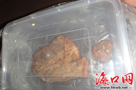 陳先生夫婦到海甸島三東路與人民大道交匯處某茶藝快餐廳就餐時,發(fā)現(xiàn)全熟的牛排肉體內(nèi)有疑似已經(jīng)死亡的蟲子類物體,要求餐館負責(zé)人與其一道將該食物送到附近醫(yī)院化驗遭拒后,遂向食品藥品監(jiān)督管理部門投訴。今天(11日)上午,美蘭區(qū)食品藥品監(jiān)督管理局執(zhí)法人員對該牛肉食品進行封存送檢。