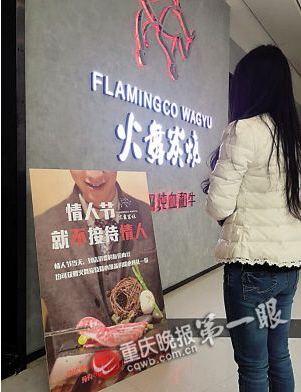 位于南岸區(qū)時代星光廣場的火舞炭燒主營炭燒、烤肉,他們打出的廣告詞是———情人節(jié),就不接待情人(如圖)。“我已經(jīng)給服務(wù)員打好招呼,遇到手挽手成雙成對的恕不接待。”老板蔡彥旭,情人節(jié)不能只有耍朋友的開心了,單身的人悲傷度過。他準(zhǔn)備唱反調(diào)到底,他還會給屆時前來就餐單身人士準(zhǔn)備一份禮物。