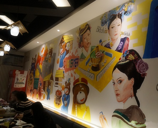 然而追求美食本身的同時(shí),已不能滿足立志做一個(gè)不一樣火鍋店的愿望。店里最醒目的就是一副巨大的18平米手繪墻畫。這個(gè)墻畫里面可是藏著貨真價(jià)實(shí)的“紅包”——每一位進(jìn)店的小伙伴都可以抽取紅包拿到問題,去壁畫中尋找答案,答對(duì)就有對(duì)應(yīng)的現(xiàn)金折扣。還有唱片墻、紅酒墻、照片墻……幾乎每一個(gè)角落里面都是暗藏玄機(jī),店內(nèi)百種創(chuàng)意玩法!