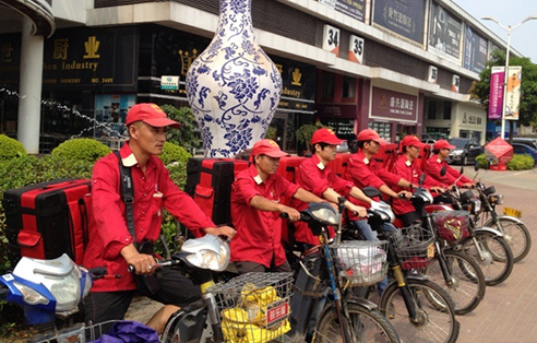 現(xiàn)在我有13個專職送餐員,4個兼職送餐員,還有外包物流公司的配送人員,一共20來個人,其中有總負(fù)責(zé)人。距離遠(yuǎn)的地方,我就放兩個人在那邊待著,餐廳的人像接力棒似的,25分鐘會過去一趟。高峰期就馬上放一個人過去,一趟送完再回來接力。中午最多是2個高峰期,11點半和12點。我也會按區(qū)域劃片,高峰期不同的區(qū)域會有不同的人負(fù)責(zé)。我對送餐員也會有培訓(xùn),高峰期不同的線路會互相支援。
