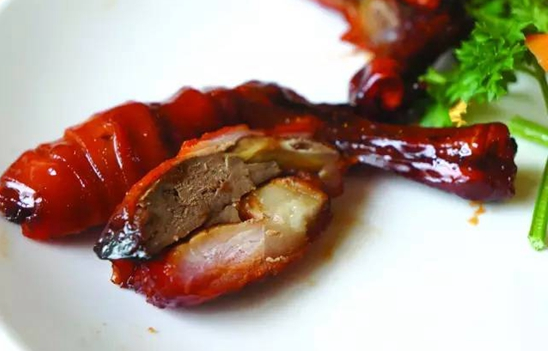在清末民初的廣州,已經(jīng)有出現(xiàn)的“鴨腳包”,又稱“鴨扎”,它比“桂花扎”還要早流傳在廣式燒臘檔中。在那時(shí)候,無(wú)論是大小酒樓還是街邊燒臘鋪,都會(huì)見到鴨腳包的身影,但具體是誰(shuí)首創(chuàng)的,就不得而知了!傍喣_包”顧名思義,就是用鴨腳包食材再用鴨腸捆扎,放入爐中烤制。而鴨腳包著的食材,既有鴨肝或者雞肝,也有肥叉燒或者冰肉。