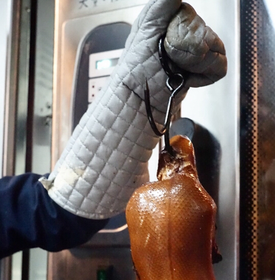 烤鴨一出爐,就會(huì)被立刻分割,如果沒(méi)有馬上做成漢堡送到運(yùn)氣超好的客人的嘴里,就會(huì)把分好的鴨皮和鴨肉分開(kāi)專門保溫。對(duì)烤鴨了解至極的大董專門為鴨皮和鴨肉分別設(shè)計(jì)了不同的保溫箱,溫度和濕度都不一樣,以保持剛出爐的風(fēng)味。鴨子最多在里面呆四十分鐘,這是大董認(rèn)為可以保持鴨皮噴香酥化、鴨肉多汁鮮嫩的完美狀態(tài)的時(shí)間范圍。在這個(gè)時(shí)間內(nèi)沒(méi)有用完的鴨子,就不要了。
