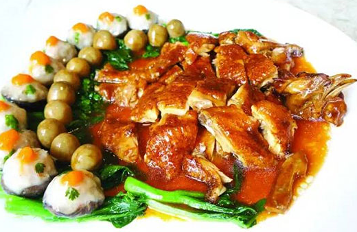 制作茅臺雞,還必須有百花釀花菇、草菇和菜心軟伴碟。百花釀花菇是用新鮮的蝦肉打成蝦膠,每粒5錢重釀入1元硬幣大小已經(jīng)入好味的花菇內(nèi),需釀制10粒,最后在百花餡上點上新鮮的蟹膏。
