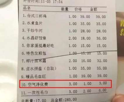 你可能用過空氣凈化器,也可能聽說過“空氣凈化費”,但你一定沒有在餐廳給過這項費用。近日,江蘇省張家港市一家餐廳因為違規(guī)收取“空氣凈化費”,被當?shù)匚飪r局警示。