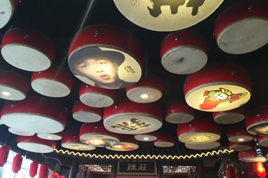 近1000平米的門臉面積,3層樓高的高度,即使立在簋街也相當扎眼。將此門面化整為零分割區(qū)域,把辣擎火鍋的標簽掛出來,“穿越文化老火鍋”“中國十大麻辣火鍋”“一次性用油老火鍋”。