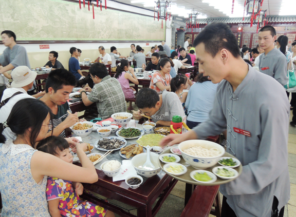 “來了,您哪,幾位,里邊請”、“小二,倒茶”這樣的高喊聲從人們一進門就伴隨在耳邊,讓人一下子沉浸在老北京的市井文化中,隨之而來的便是穿對襟衣衫,蹬圓口黑布鞋、戴瓜皮帽、肩搭手巾把兒的小伙計,帶著顧客來到大理石的八仙桌前,落座在紅漆實木的長條凳上。觀賞著一幅長約16米的畫作《清明上河圖》,聆聽著京韻大鼓,不知道還以為自己在排古裝戲!吃好喝好后,又會在門童和小二“送客、走好、您哪”的喊聲中愉快地離開。不過,與韻味十足的老北京氛圍不同的、能讓人回到現(xiàn)實的,是前臺的電腦軟件結(jié)賬系統(tǒng)和寬敞明亮的就餐大廳,向人們傳遞著現(xiàn)代科技與生活流行色交織在一起的飲食時尚。