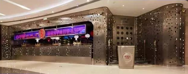 遠(yuǎn)處看像盤踞在商場里的金屬洞穴,外圍用不銹鋼緊緊包裹,墻壁上安置了碩大的金銀兩色蜘蛛。在進(jìn)門處,運(yùn)用高科技手段,用水幕再現(xiàn)了一個逼真的水簾洞。餐桌上每個蜘蛛都帶上了緊箍咒,這些蜘蛛也成為嘻游記餐廳的標(biāo)志元素。設(shè)計時沒有刻意去塑造西游記的形象,而是用很多插畫來表達(dá)現(xiàn)代想象。翻開菜單就像是翻開一本故事書,菜名都非常有西游記特色,例如“俺老孫最牛”、“女兒國的春夢”、“松茸洋芋紫金缽”等。