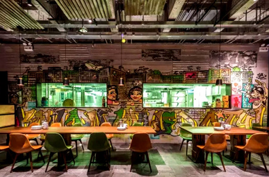 成名于香港的梁經(jīng)倫自然不會(huì)錯(cuò)過這個(gè)有意思的“罪惡據(jù)點(diǎn)”。Daimon Bistro的入口是一扇深褐色的鐵門,從曖昧的紫色燈光開始,破舊的木板墻、模仿腳手架搭起的竹吧臺(tái)、陳舊的電表、半開放式廚房外的涂鴉墻,連客人的衣帽間都被設(shè)在鐵網(wǎng)區(qū)域內(nèi)……每個(gè)細(xì)節(jié)似乎都是九龍城寨的縮影。