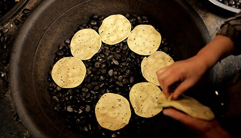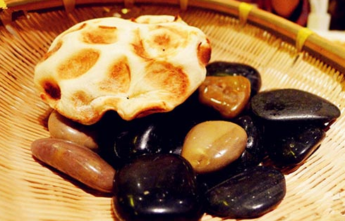 石子饃具有明顯的石器時(shí)代“石烹”遺風(fēng),唐代亦稱(chēng)“石鏊餅”因其是將餅坯放在燒熱的石子上烙制故而得名,又稱(chēng)砂子饃。石子饃其歷史源遠(yuǎn)流長(zhǎng),各地都有,晉陜及中原地區(qū)非常流行,石子饃主要原料是面粉、調(diào)味料和動(dòng)植物油,石子饃的餅胚放在一鍋又黑又圓的石子上面,烤出來(lái)的面餅外觀焦黃鮮亮,中凹邊突,咬開(kāi)后層次分明,外酥內(nèi)軟。石烙工藝講究傳熱均勻,火力不能太小或太大。太小則無(wú)焦香味,更無(wú)酥脆的質(zhì)感,太大則外焦而內(nèi)不熟,對(duì)成品外型也會(huì)有很大影響。由于石頭本身是熱的良導(dǎo)體,傳熱均勻迅速,使烹調(diào)時(shí)間得以有效地縮短。在生產(chǎn)資料極端匱乏的古代,采用石烹技法是個(gè)聰明又健康的方法。