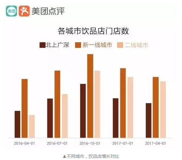 根據(jù)美團點評公布的一項數(shù)據(jù)顯示,2017年4月,二線城市飲品店門店數(shù)同比增長為29%,而在北上廣深,這個數(shù)字是6% 。