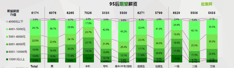 趕集網(wǎng)調(diào)研數(shù)據(jù)顯示,2018年95后應(yīng)屆畢業(yè)生期望薪資的均值為6174元,其中9.5%的畢業(yè)生希望月薪超過(guò)10000元,而40%的畢業(yè)生對(duì)月薪的期望都超過(guò)8000元。與往屆生相比,應(yīng)屆生對(duì)薪資的期望更高。然而,95后應(yīng)屆畢業(yè)生的實(shí)際薪資平均值為5429元,80%的畢業(yè)生實(shí)際薪資在8000元以下,這說(shuō)明理想與現(xiàn)實(shí)仍然存在一定差距。