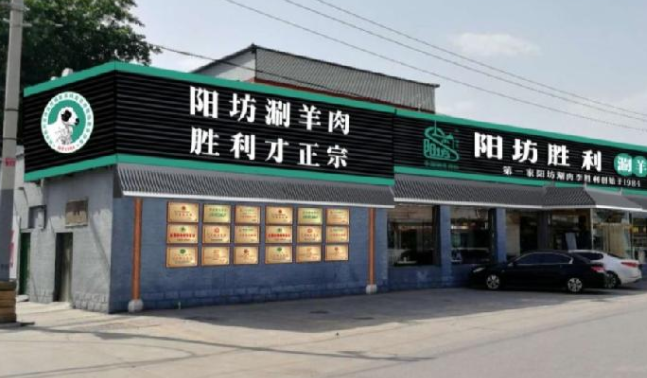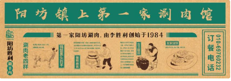 首先確定了陽坊鎮(zhèn)老店的門頭上的品牌故事:第一家陽坊涮羊肉由李勝利創(chuàng)始于1984,強(qiáng)調(diào)“陽坊涮羊肉,勝利才正宗”。