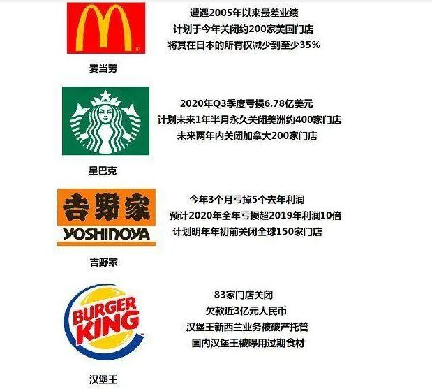 在新冠疫情的影響下,不只是吉野家關(guān)店自救,麥當勞關(guān)店200家,星巴克關(guān)店400家……為應(yīng)對危機,曾經(jīng)在全球“開疆拓土”的國際餐飲知名品牌紛紛關(guān)店。